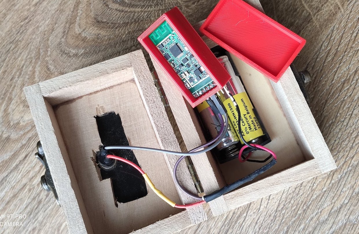 Thus, for the special gift of reinstated control of her Reading Light, a visit to the craft store rendered a tasteful wooden box, replete with dainty (not!) hooked fastener. The box, just large enough for the Cricket and two AAs, would be easily drilled for the push-button switch.