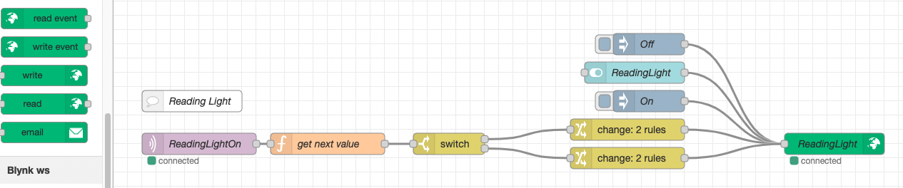 One of my favorite Blynk/ESP switches is attached to the reading light above the matrimonial bed. At the command, "Reading Light Off" we're plunged into darkness without the need to interrupt our semi-conscious state to stretch up to flick the switch. Significant Other grew accustomed to my nightly mantra, even participating herself when I'd fallen into premature slumber.