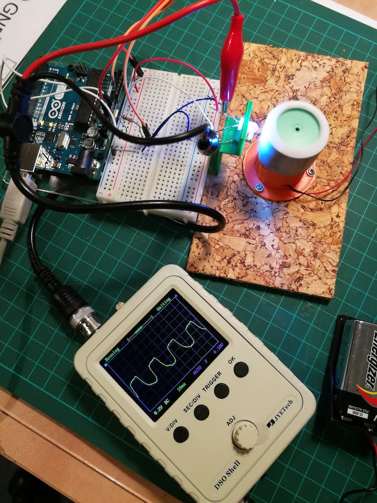 I was about to wire it up when co-blogger Allan suggested I use the little oscilloscope I'd constructed from a kit a few months ago. (There are a lot of reviews of this kit all over the web. If you're just a hobbyist like me, I can't recommend it strongly enough. Yes, it has only one noisy channel and yes, it can't register below a certain frequency, but if you just want to see if your Arduino (Raspberry Pi) pins are switching on and off, it's a brilliant little gadget. This project illustrates just how useful it is. It's also great fun to build!)