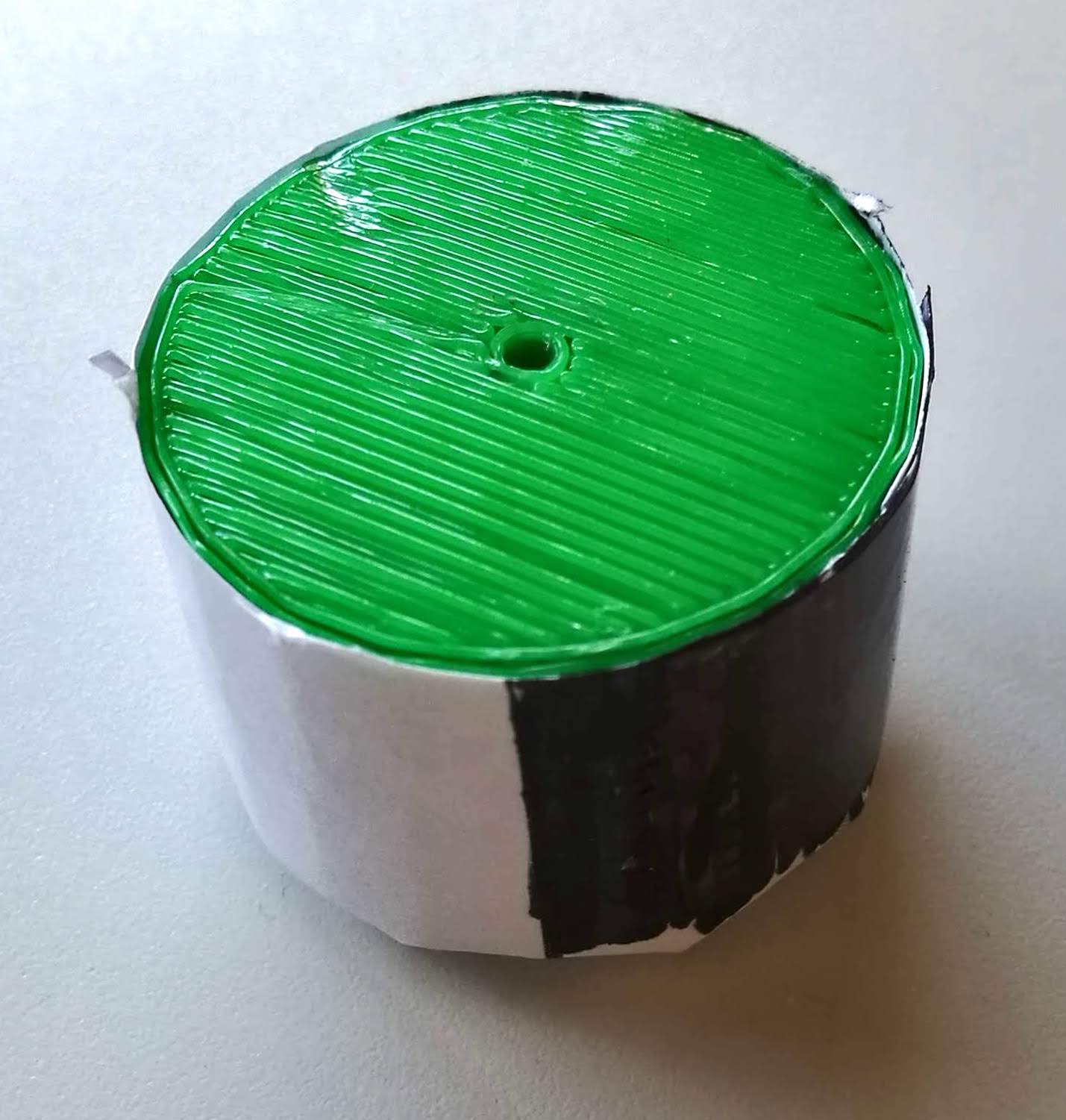 For my prototype I took a strip of paper and glued it around the circumference of a cylinder attached to a small 5v motor. One side of the strip I left white, the other side I coloured with a black marker.