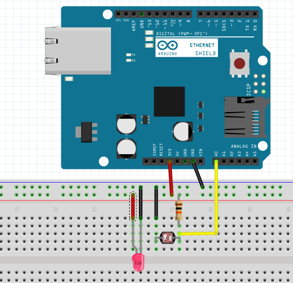The code is only a few lines. The LED is permanently on, so doesn't need to be controlled. The LDR is connected to A0 (an analog pin) and a reading taken.