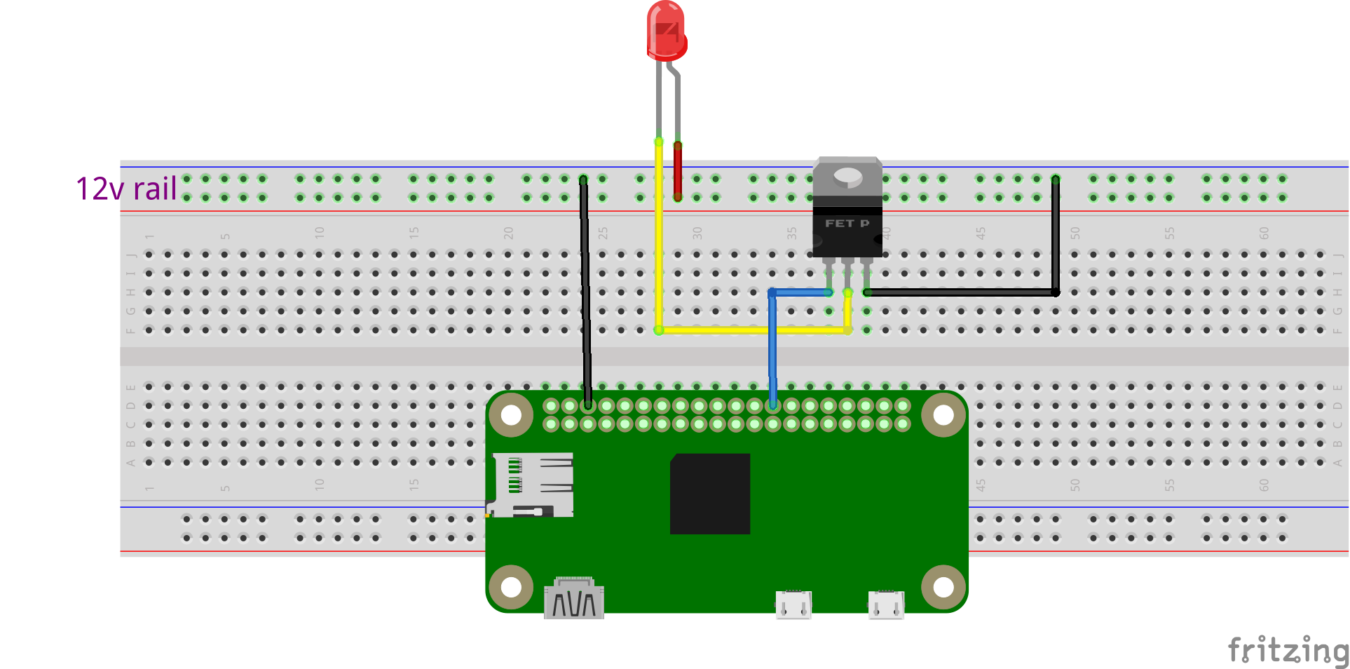 - Notice the LEDs run on the 12v rail. However, your RasPi GND should connect to the same rail, as illustrated. (Note, the LED in the diagram is for illustration only. It is not the LED I used in my build).