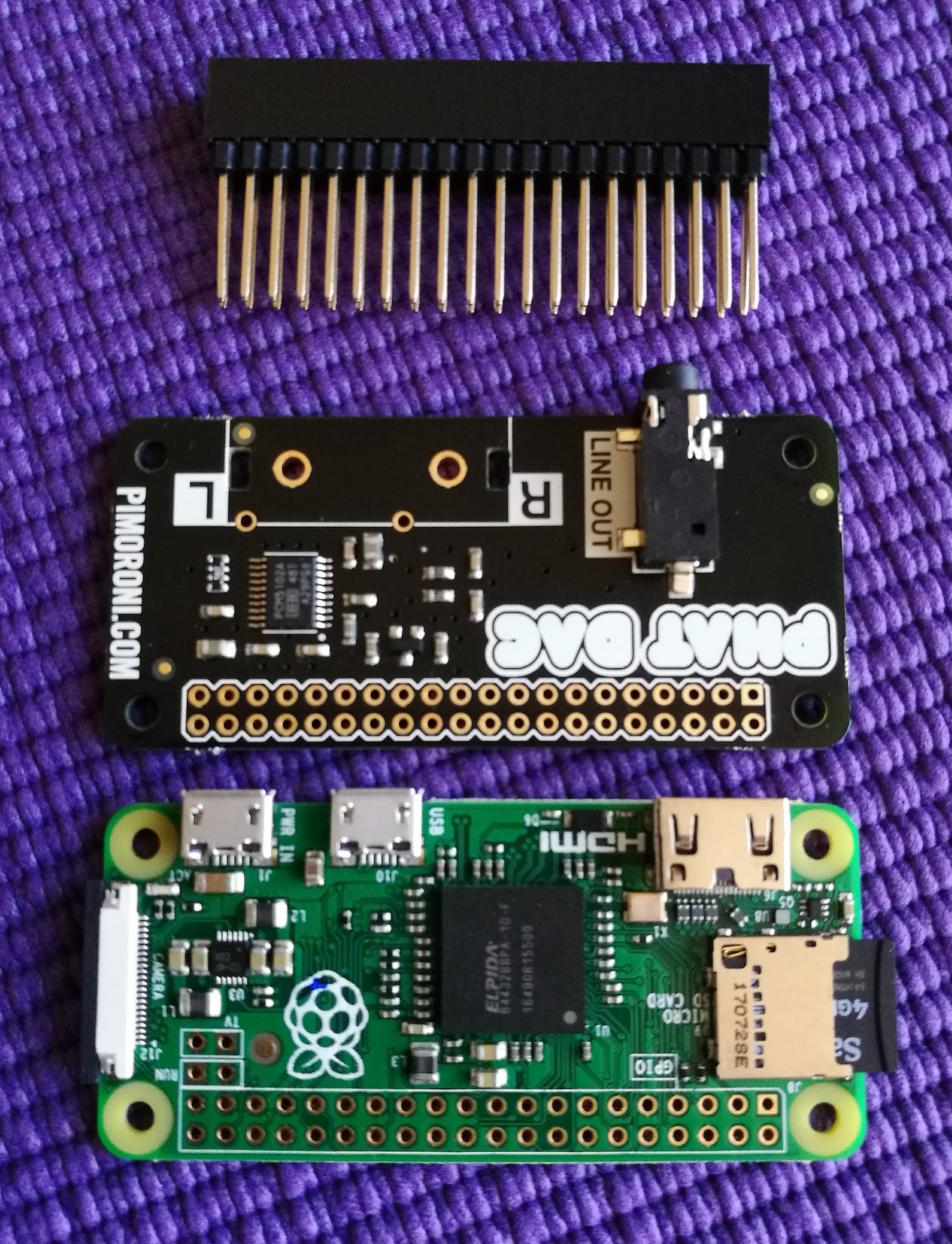 - Pimoroni pHAT DAC - a digital-audio converter required for two purposes - 1) to gain access to the Pi Zero's audio output and 2) improve its native audio. (More about this below).
