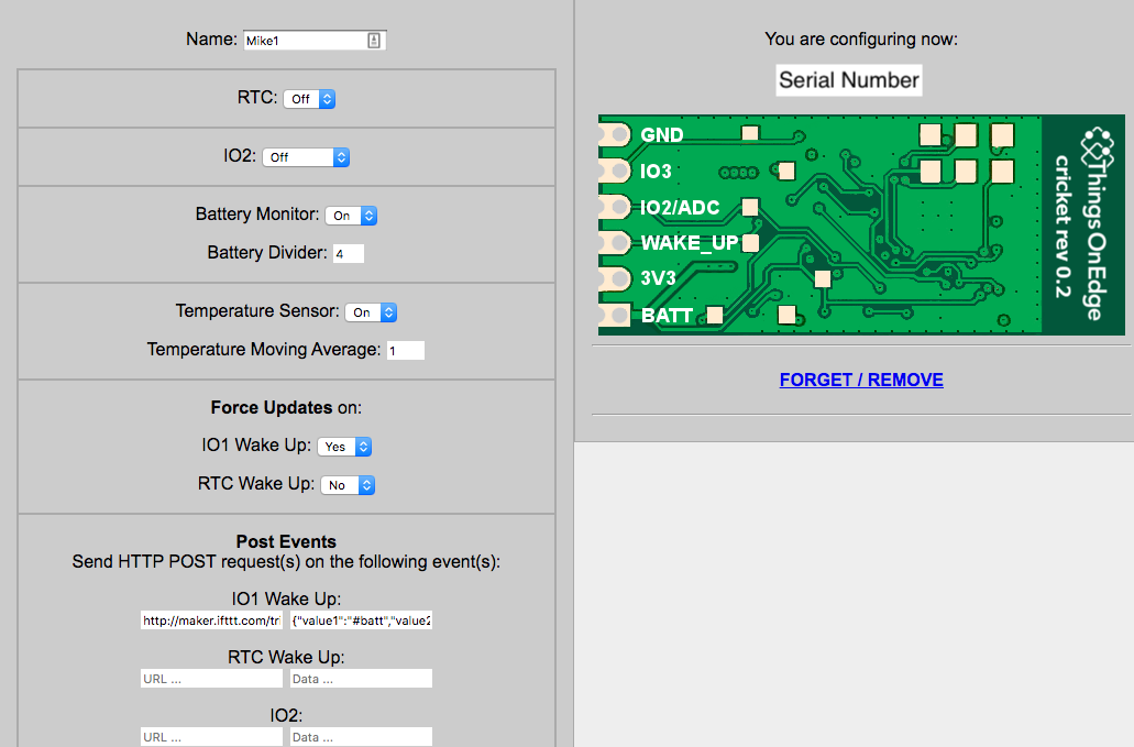 When I first installed the Cricket, I had it send an email through IFTTT. For an hour I couldn't get the battery or temperature data to come through. I eventually turned to the developers. I suppose one of my functions is to help them debug because they then realized that IFTTT had changed something which would require the Cricket board to be updated. So they sent me a new board.