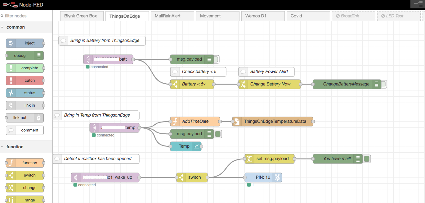 I alluded above to my adventures with MQTT and Node Red. There's no question that using them with the Cricket hugely expands its possibilities. For example, I've created a Node Red flow that takes data from the Cricket and through MQTT triggers other devices around the house. The little Mail/Rain alert board above is one example, and I'm working on expanding it to alert me to passes of the International Space Station and Covid 19 cases near my house. The Cricket integrates beautifully with MQTT and Node Red and makes flows very simple to create.
