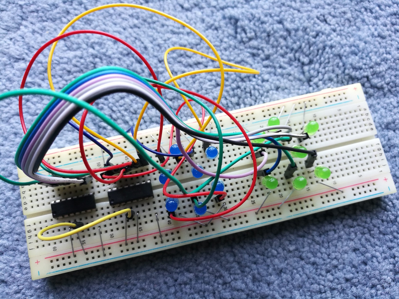 As you can see, it's a mass of wires. I didn't have a small common anode 7-segment LED, so I used regular LEDs instead. If you look carefully at the board you can see that to cut down on wires, I used staples for the GND and 5v rails. (Had I not, it would have been impossible to work with.)