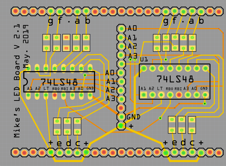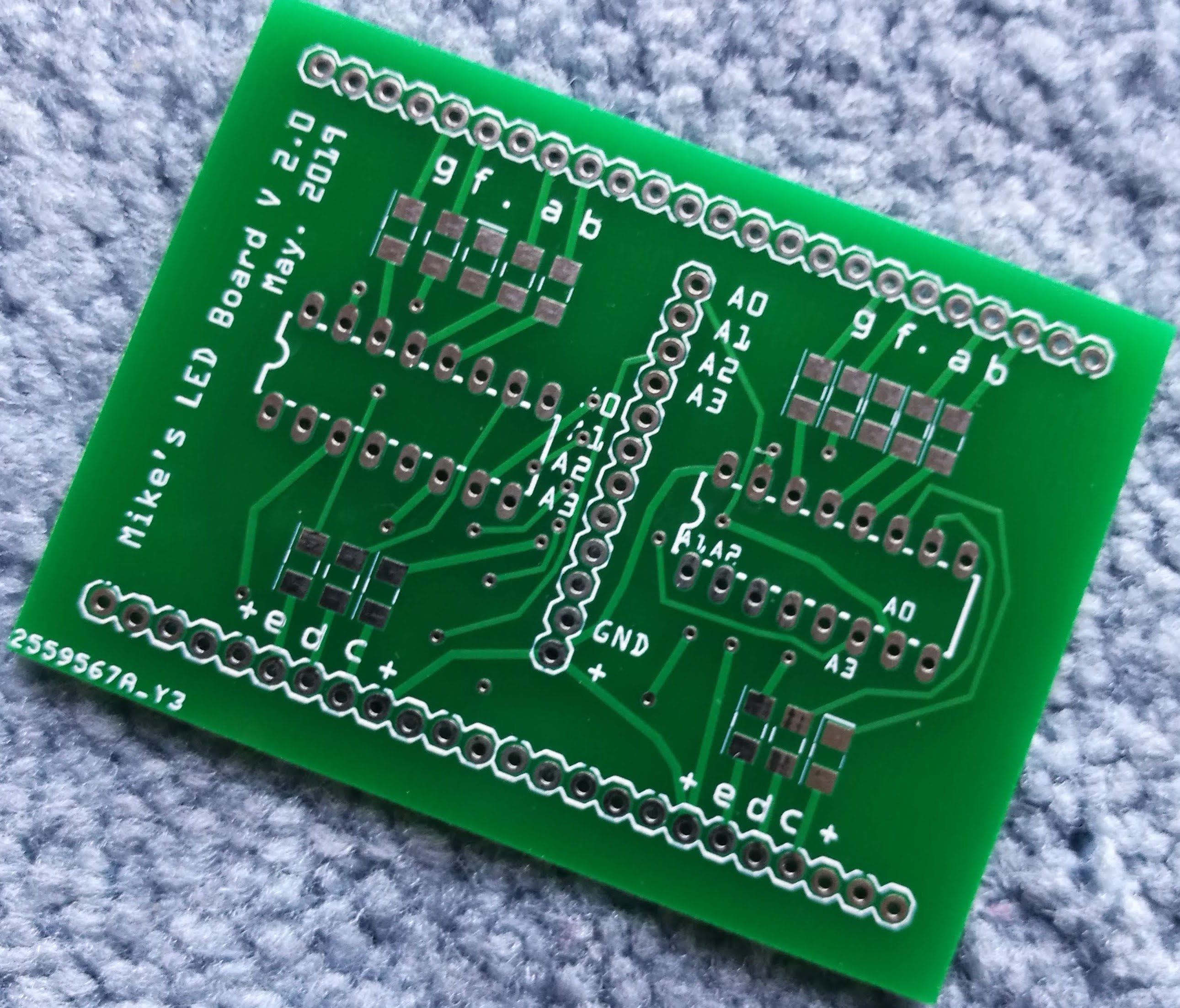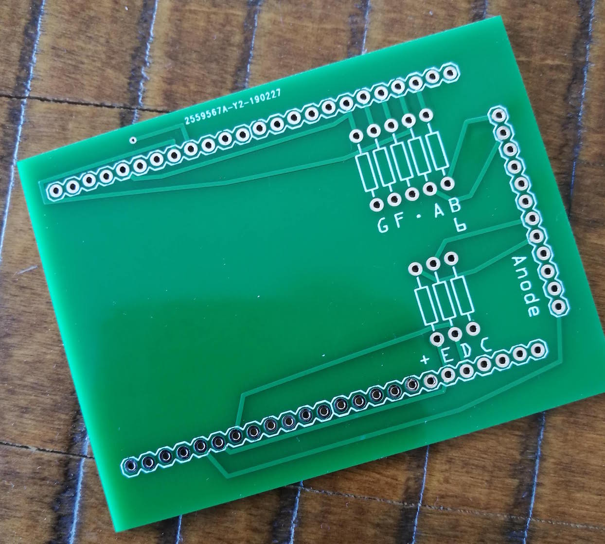 I was so pleased with PLCPCB's PCB that I quickly set about designing another - this time to house two 7-segment LEDs. At this early stage, I just wanted a board to mount and connect them. I wasn't thinking of extra electronics.