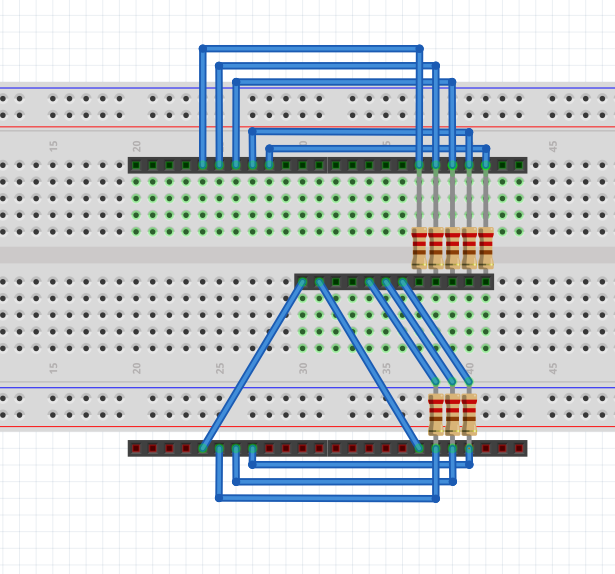 To protect the circuit, current-limiting resistors are a must when working with LEDs. So, on the breadboard I needed to add a resistor for each segment.