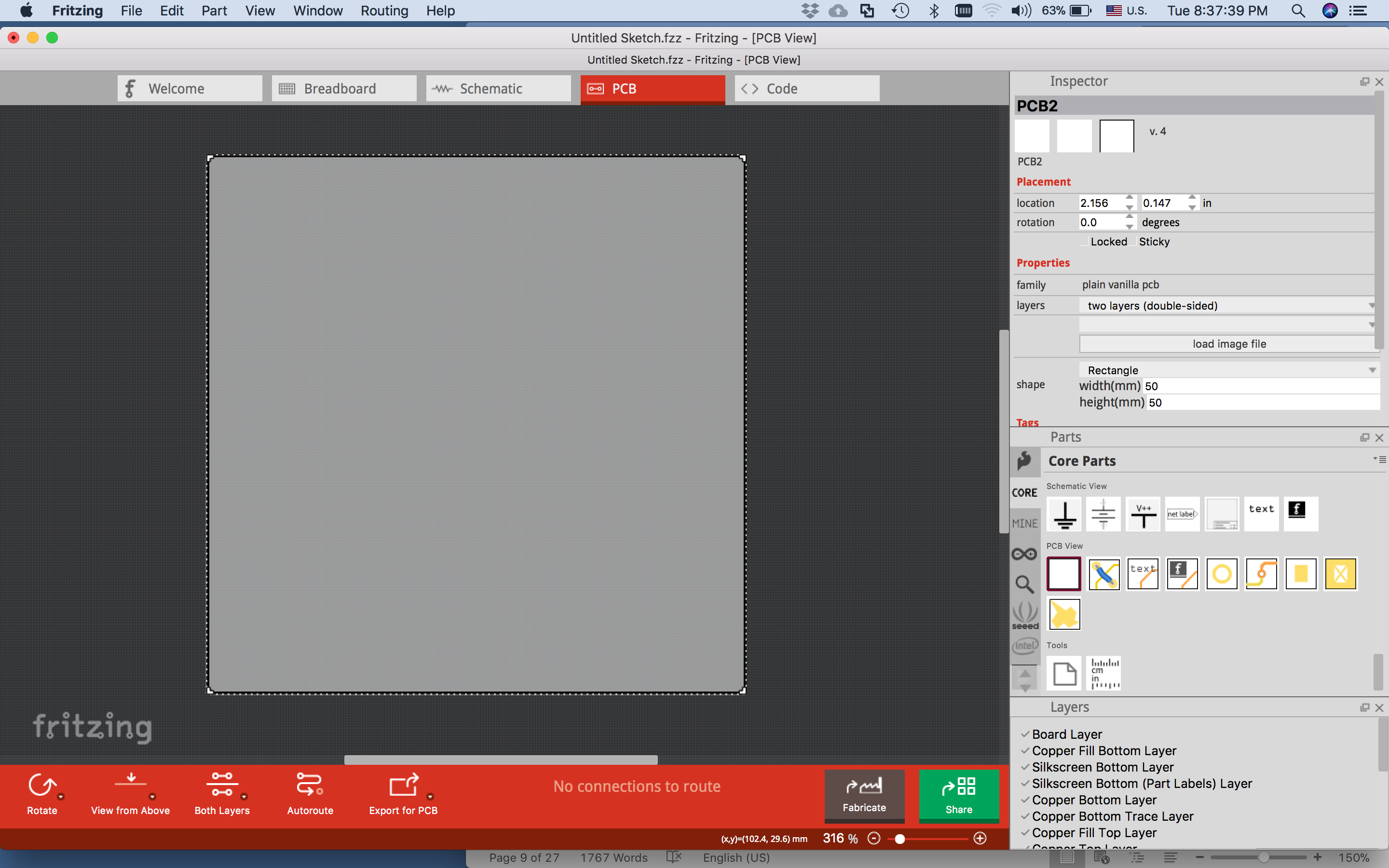 Click on the PCB board. If one doesn’t exist yet in the PCB View, click in the Parts window, click on Core Parts, then scroll down within that to PCB View. The first icon is for a new PCB. Click on that and drag it to the PCB-View workspace.
