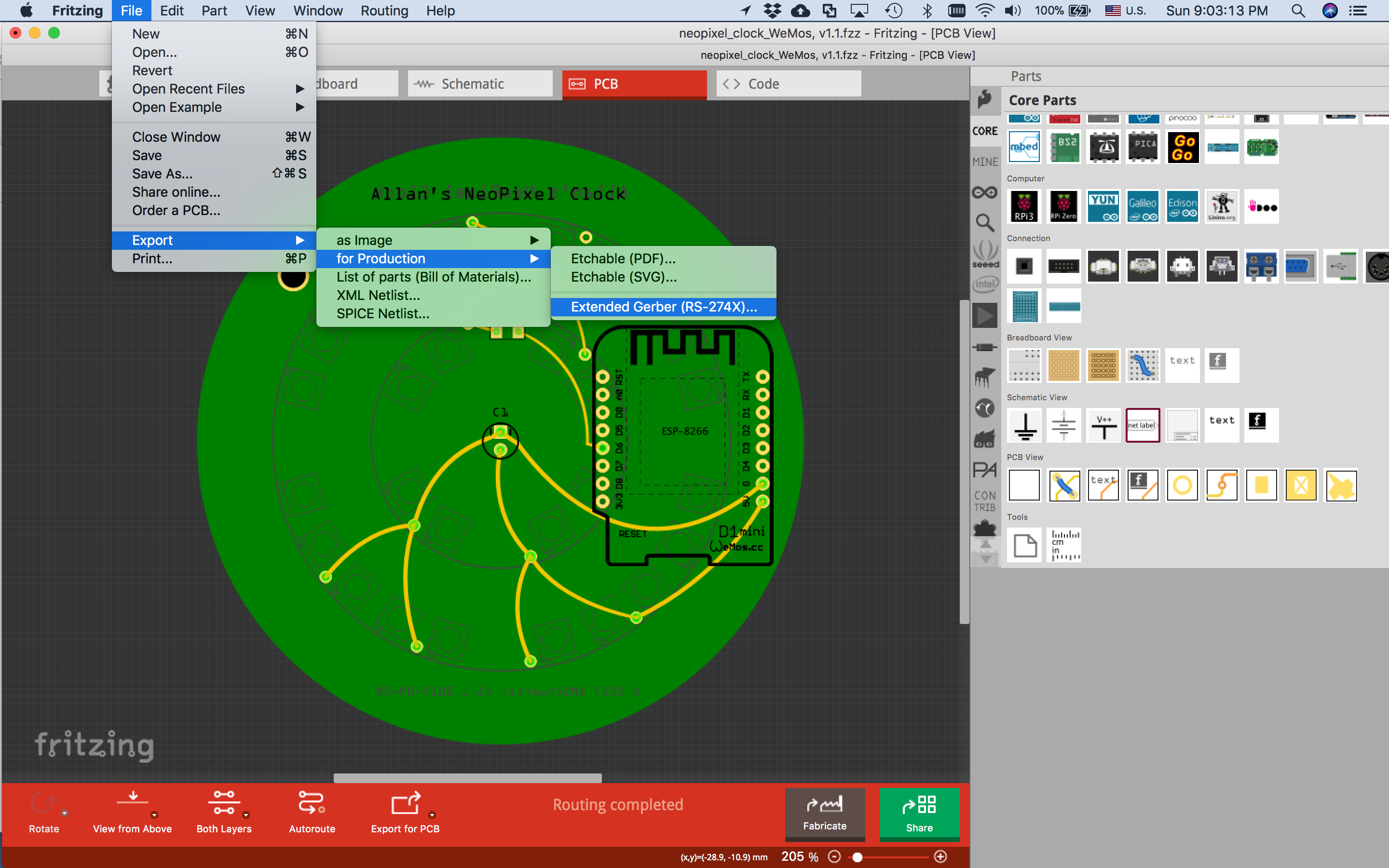 The board is now complete. I exported the Gerber Files, from the File -> Export -> For Production -> Extended Gerber Files