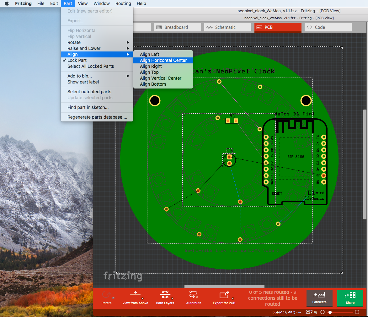I made extensive use of the Parts -> Align function, to center the Pixel Rings, and also to place the mounting holes straight.