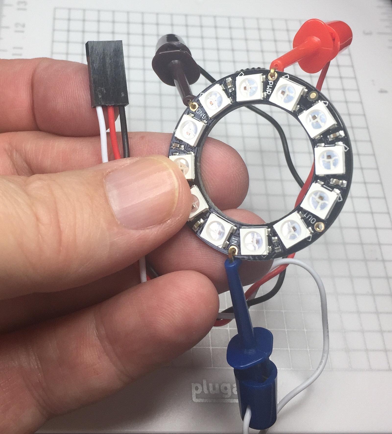 In addition to power and ground, there is only one data signal connected to the WeMos pin D6. Between the two WeMos pixel rings, the DOUT of the first ring gets connected to the DIN of the second. Using this method, the two rings appear as a single 36-LED strand of pixels.