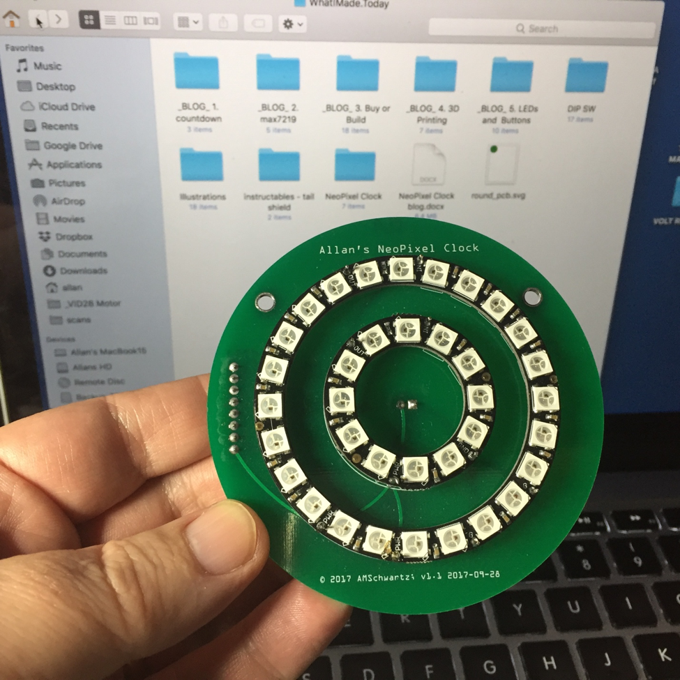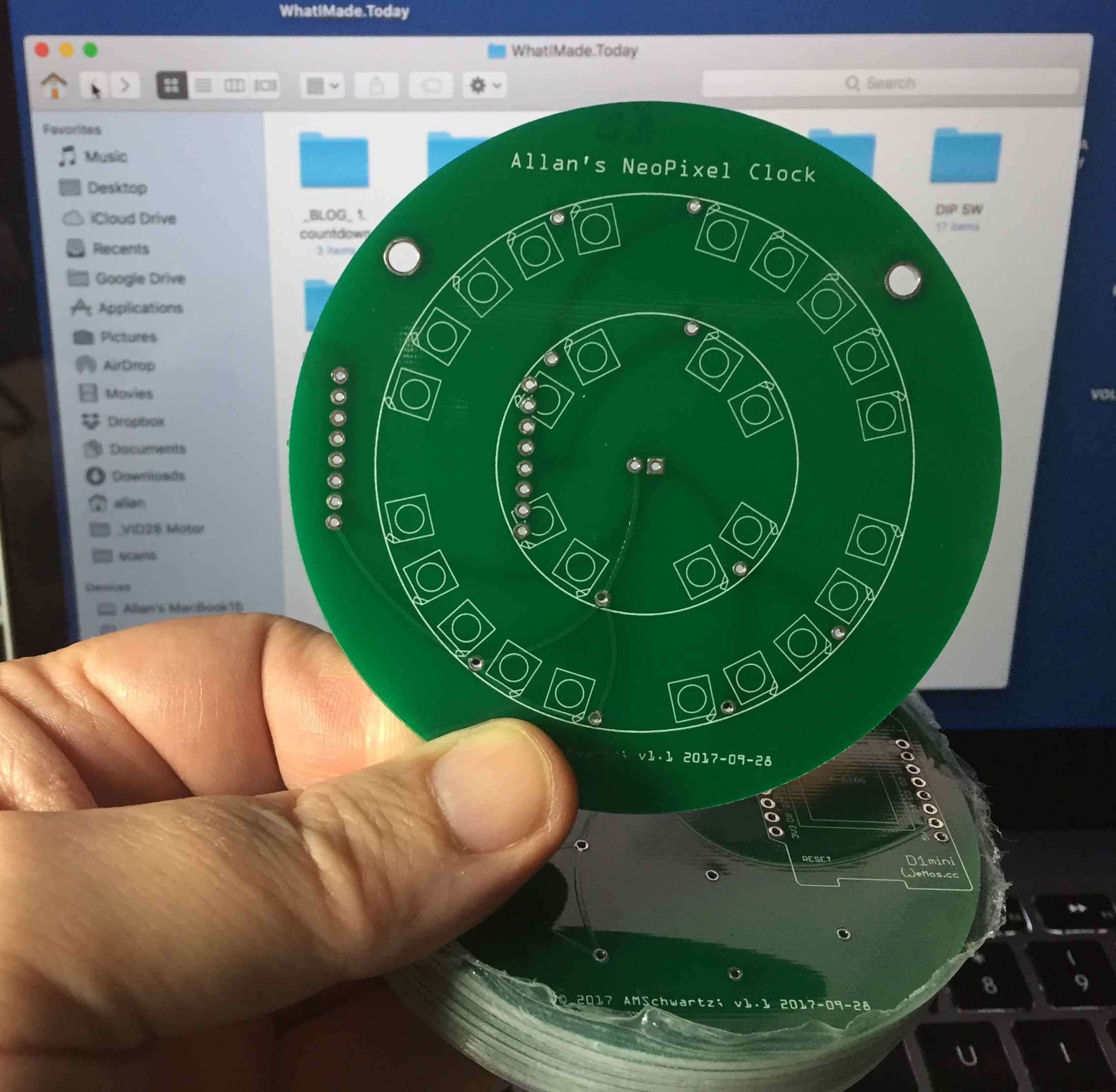 I placed the Wemos processor and nearly all traces on the above side. The View From Below – which contains the NeoPixels rings – is the user-facing side or the clock-face.