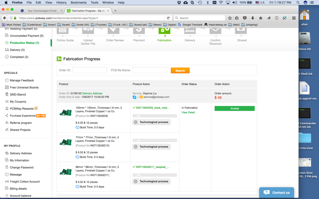 The PCBWAY web site has an efficient Fabrication Progress screen: