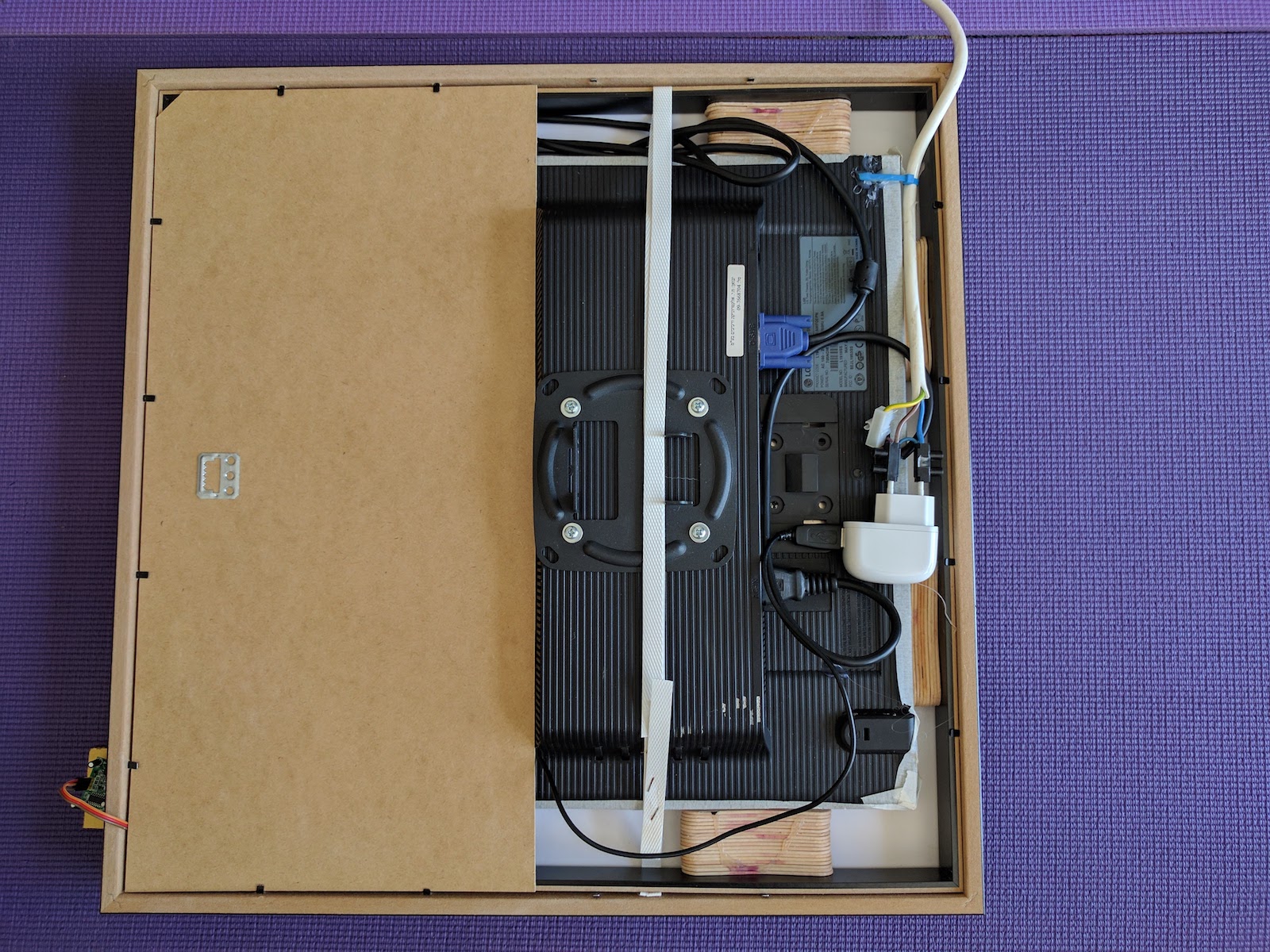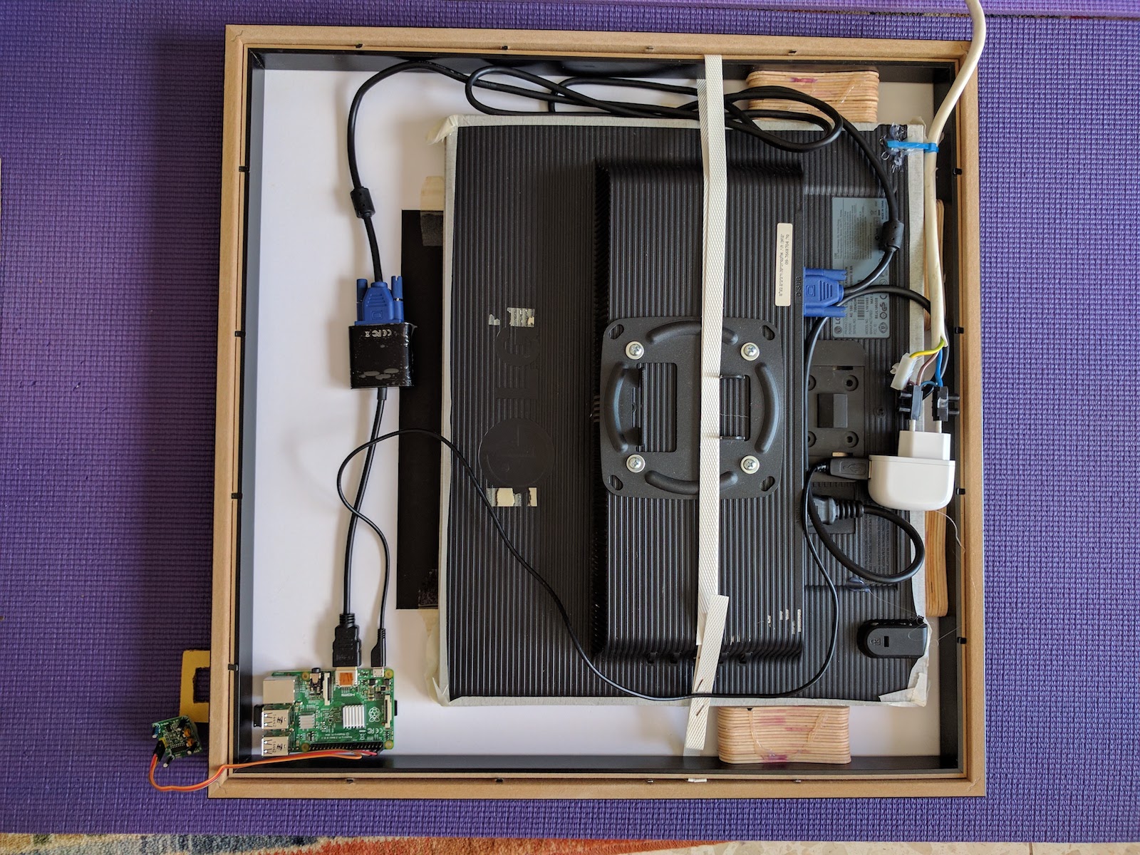 Unlike other builds, I did not remove the screen entirely from its housing. Instead, I only removed the front bezel. This has several advantages. First, it keeps all the electronics safe and protected. Second, if you save the bezel, you can easily reclaim your screen. Third and most important, because it still has its back on, you can screw on a VESA mount to attach the screen to the wall.