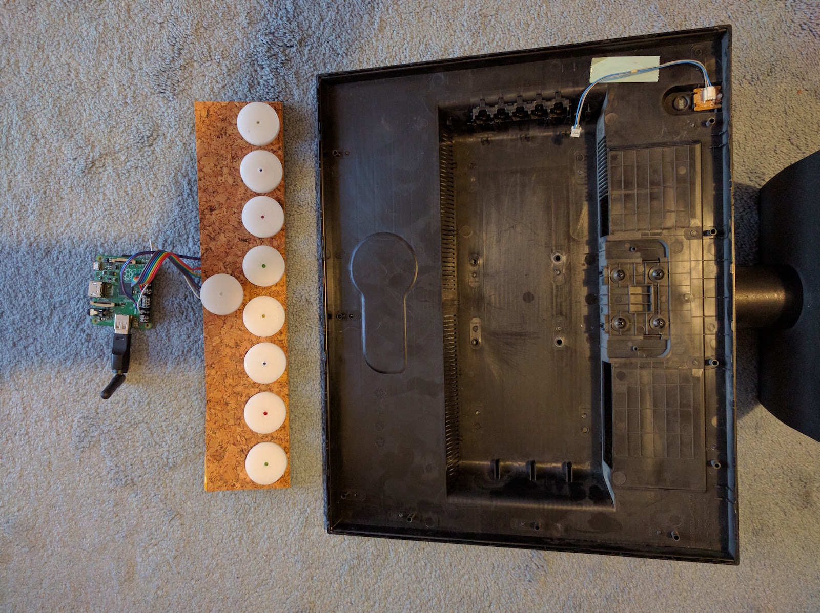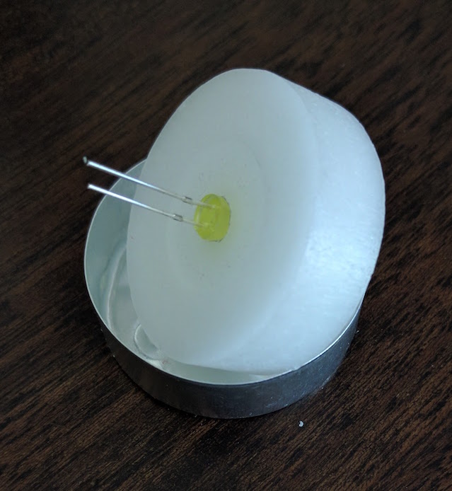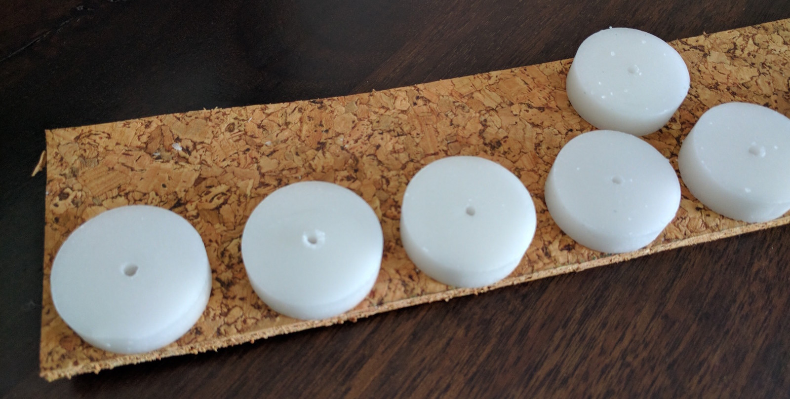 I thought it would look better if only the white candles were contrasted on a black background, without the cork getting in the way. So, I made holes in the paper at the precise locations of the LEDs and placed the the cork behind the black paper. I then put the candles over the protruding LEDs.