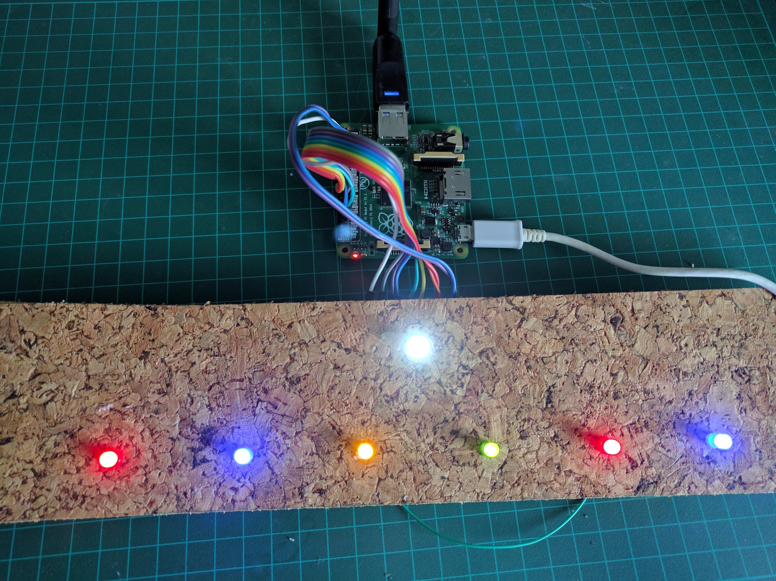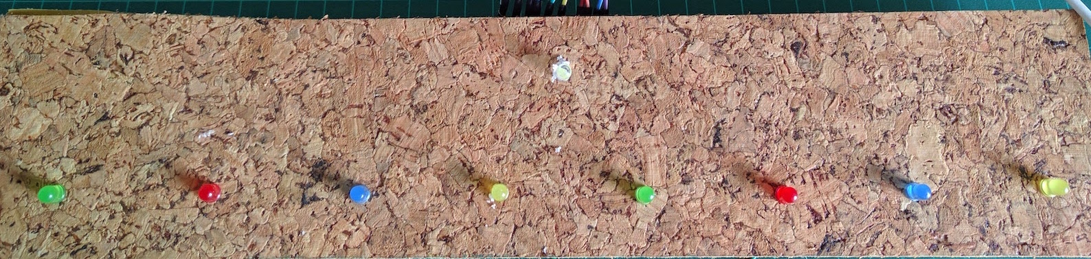So first, I cut a piece of cork and bored 5mm holes at regular intervals. I then placed my LEDs in the holes.