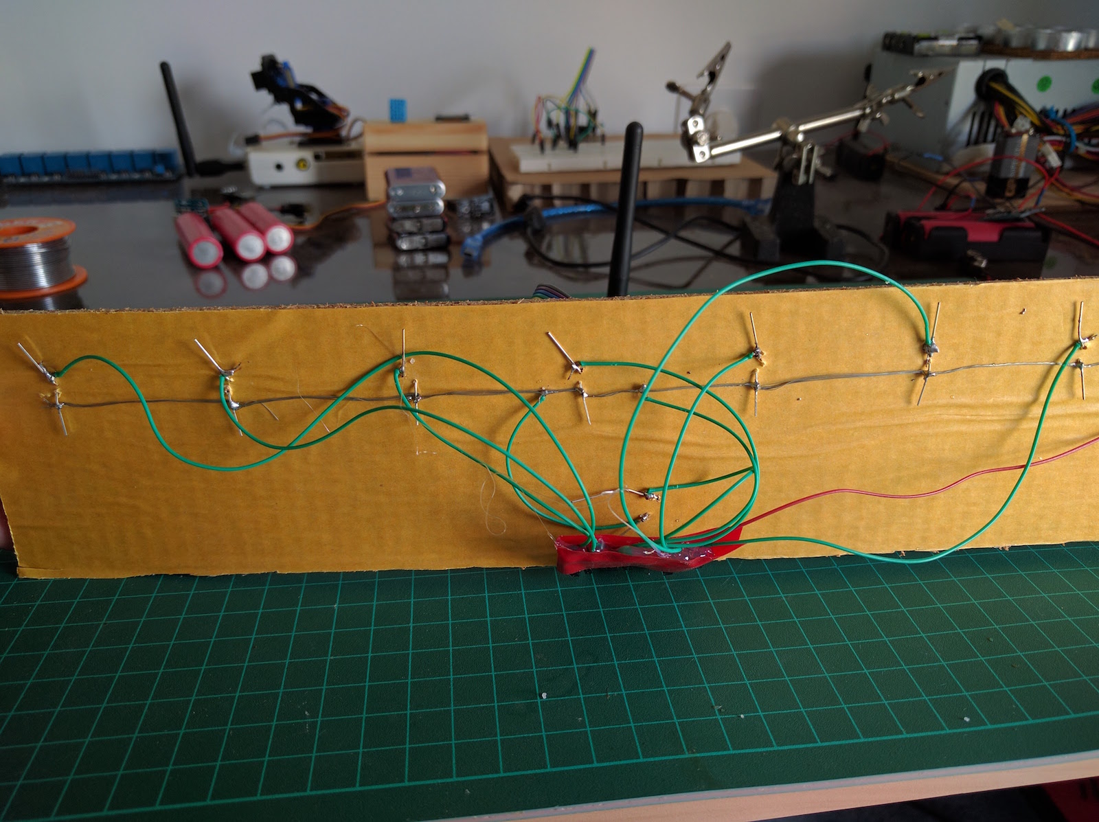 On the reverse side, I connected all the common (cathodes) of the LEDs together with fine wire.