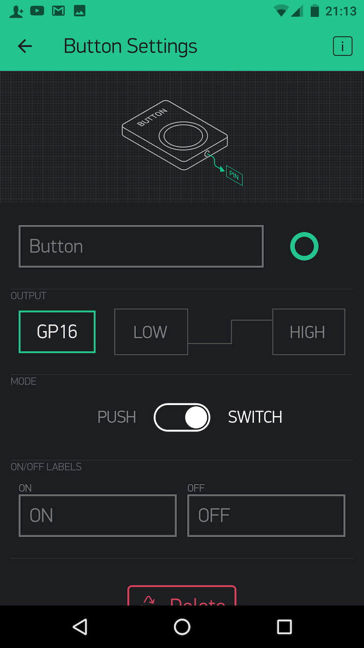 Step 3 It's time to put buttons on the app, corresponding to the GPIO pins you connected the LEDs to on the RasPi. As you'll see above, one of my LEDs is connected to GP16. Be sure to select Switch instead of Push. (The latter will keep your light lit only while you're pressing the button).