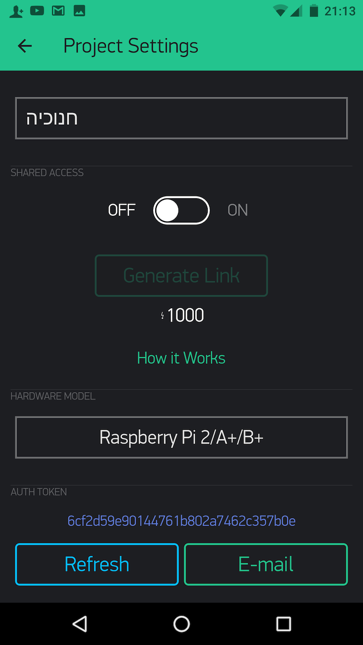 You'll see the app has given you an authorisation token. Click E-mail to send the token to the email address you gave when you registered Blynk.