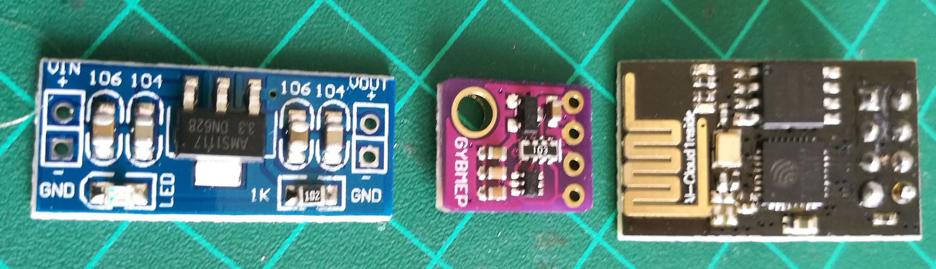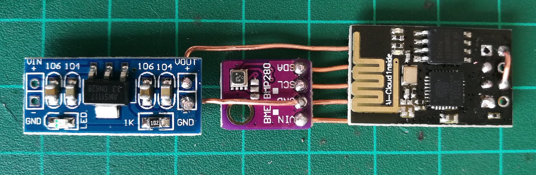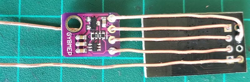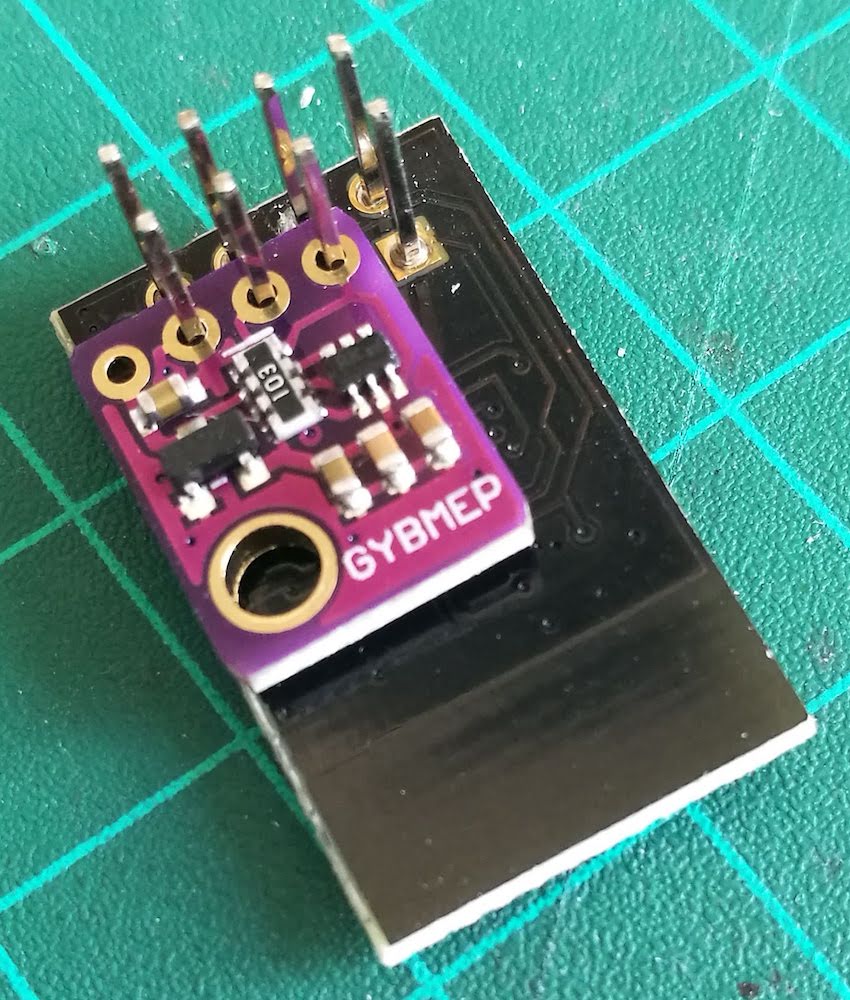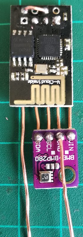 So the pins GND, SCL and SDA of the BME280 can slip directly on to the pins GND, GPIO-2 and GPIO-0 of the ESP. (This is why it's important to get the pins in the correct order in the code above.)