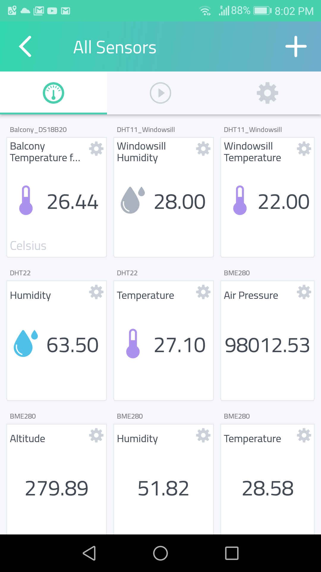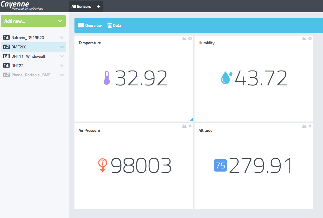 So, when you're out in the field, turn on your phone's tethering, power up your weather station, and log into Cayenne. You may need to give your BME280 a few minutes to settle down, but on your screen you'll get precise measurements for your exact location - a full blown personal weather station for less than $10!