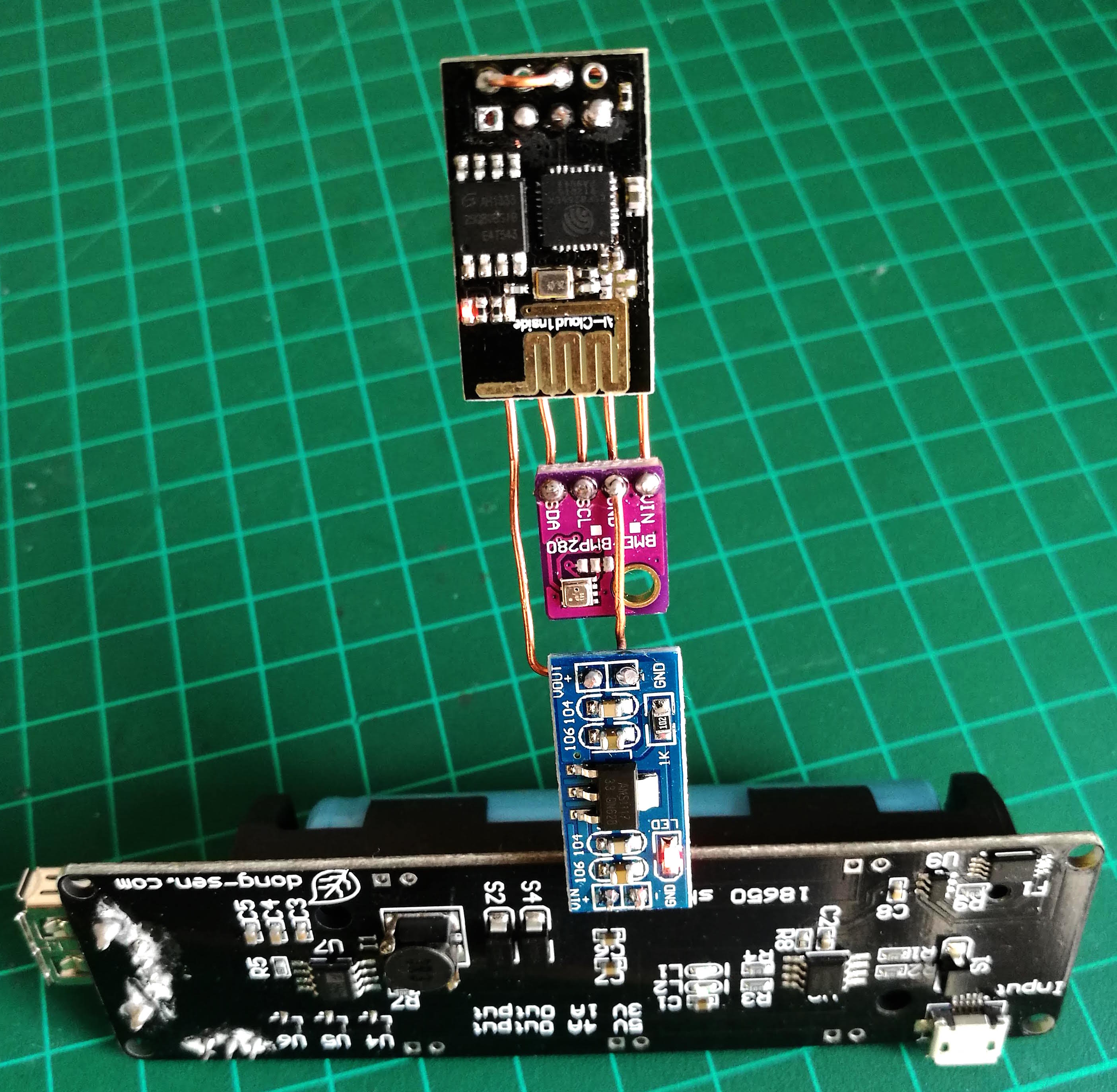 If you have one of those USB 18650 control boards, it fits very nicely into the 5v rail. (In fact my board has 3.3v at the other side so I could have done away with the AMS1117 3.3V module, but I wanted to leave the project open for alternative power options.)