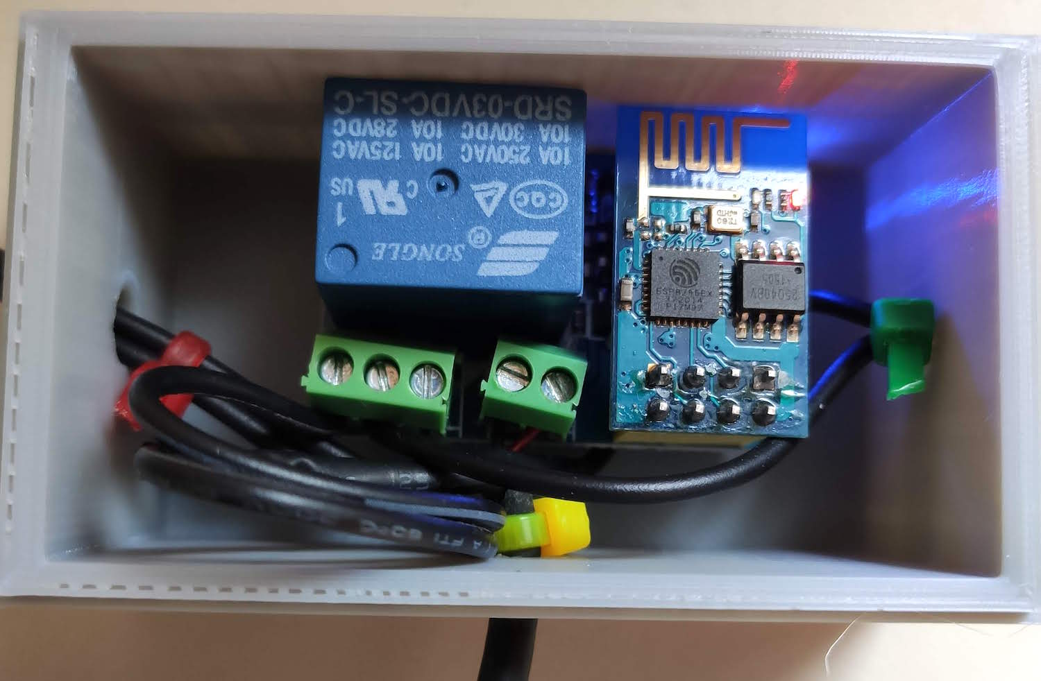 The relay sits in the middle of the router's power cable. It's switching only 12v so there are no safety issues involved. The only setback is that the ESP relay board also needs power - which I've given it through an old 5v, 1A cellphone charger. I printed a small box to put it in but decided not to cover it to prevent overheating.