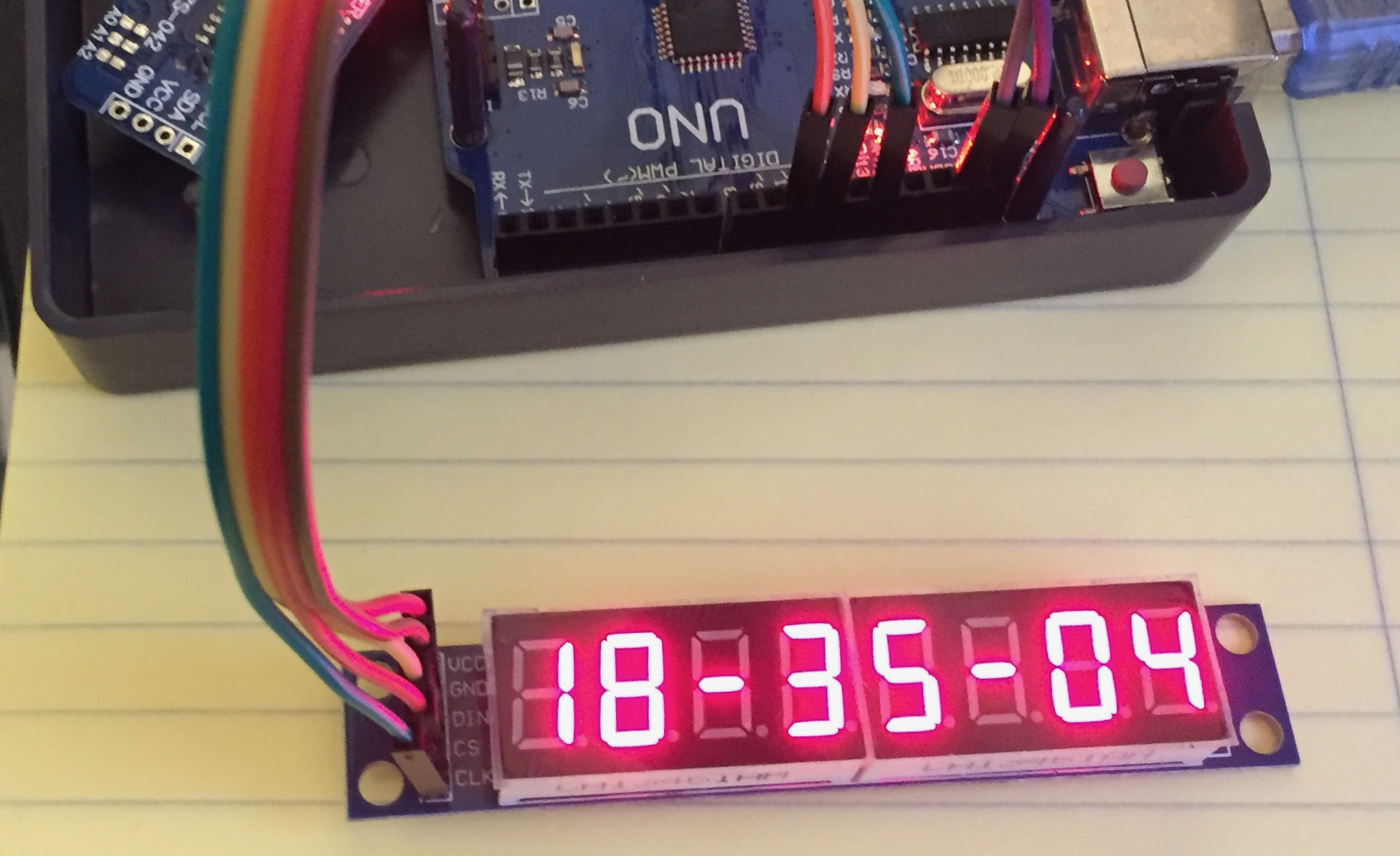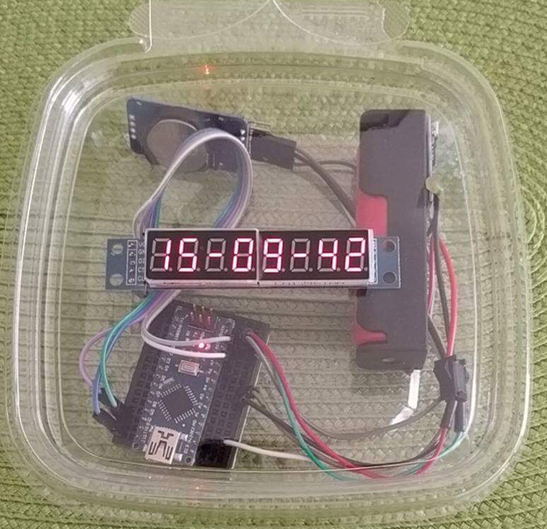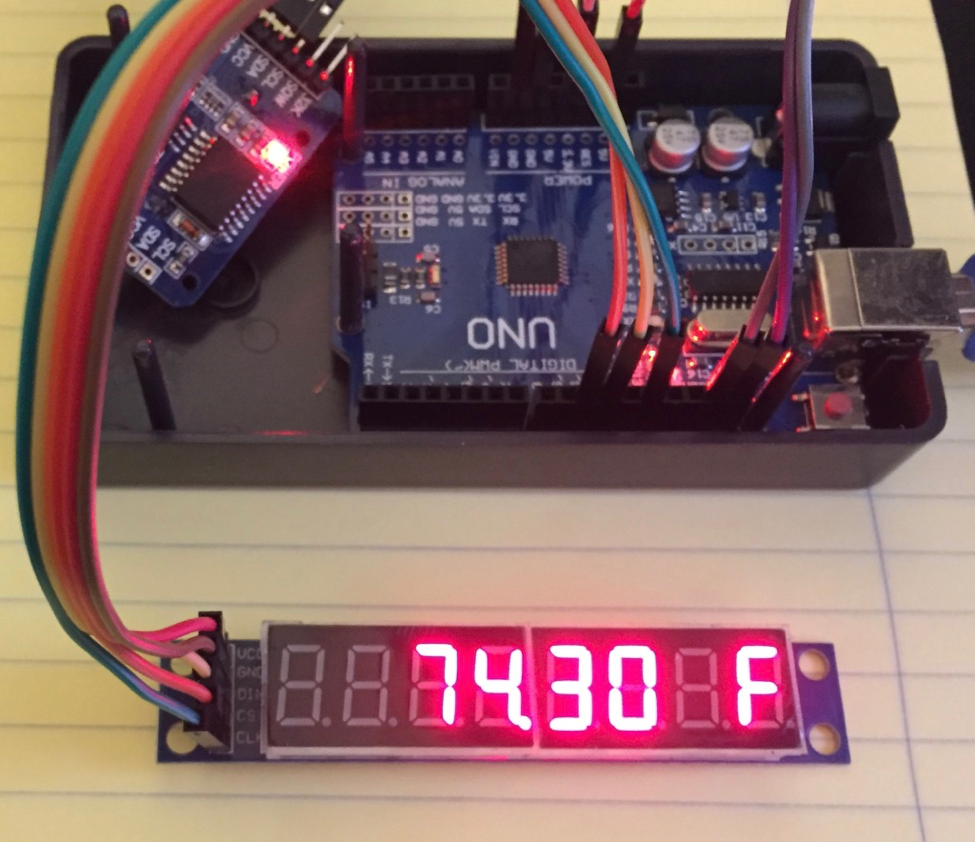 Now we are ready to describe the entire application. The purpose of the application is to display the date, time and temperature, using the 7-segment display. The date, time and temperature are read from the DS3231 chip, which is attached to the Arduino’s I2C bus.