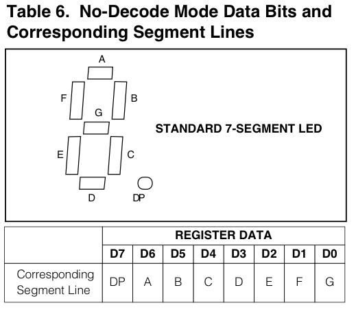 To create a character C or the character F, we have to use the no-decode mode of the MAX7219. In this case, the segments, A, B, C, D, E, F and G are controlled individually. We can refer to Table 6, from Page 8 of the data sheet: