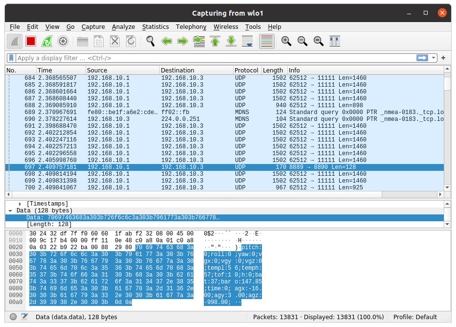 Packet's data section contains drone state in one line: