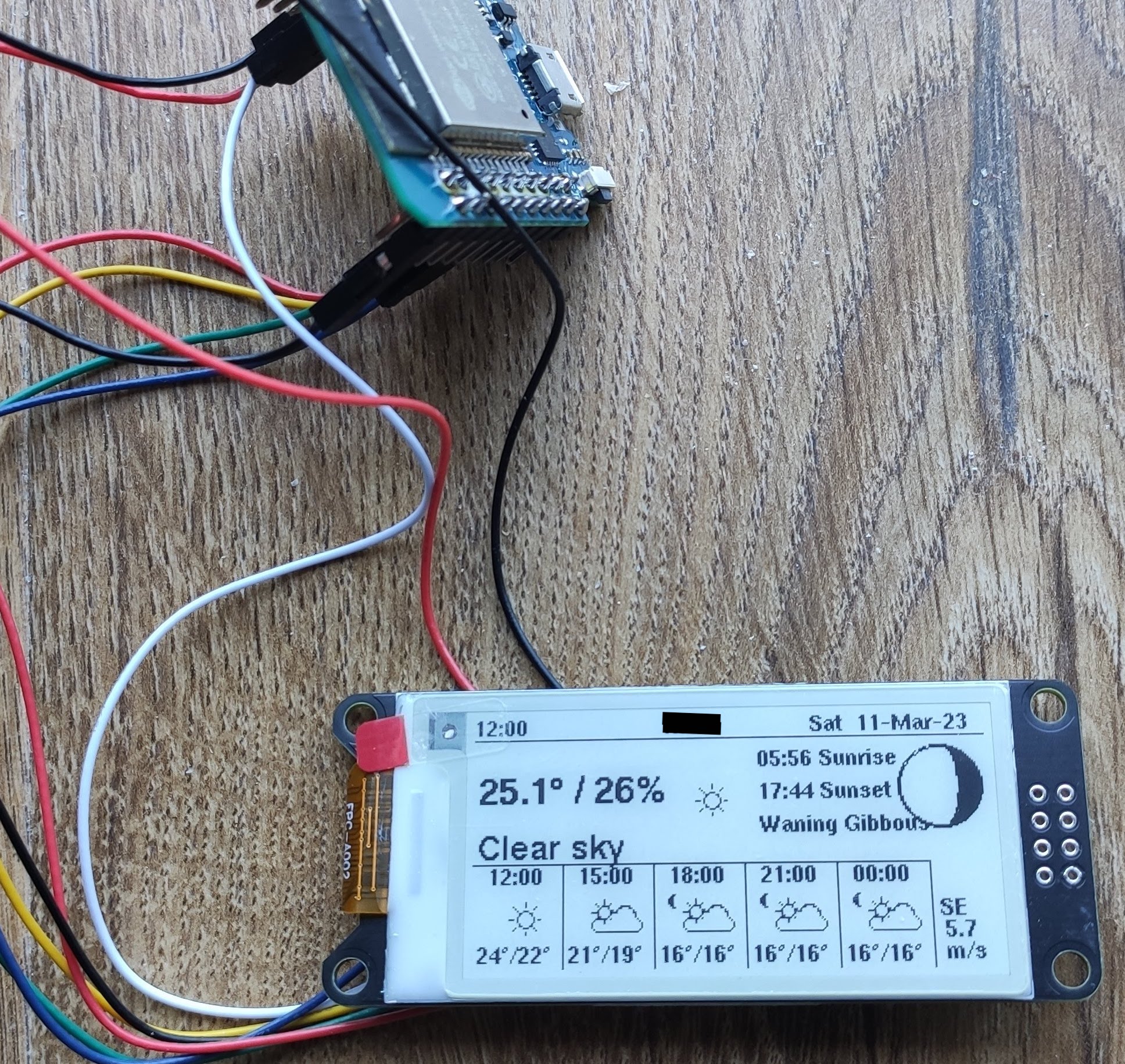 When it arrived, I set about making a weather station. A search of the internet revealed this excellent piece of coding that not only displays the weather on the screen, but questions openweathermap.org for regular updates. It also plucks the correct time from an NTP Server, then draws a beautiful rendering on the screen.
