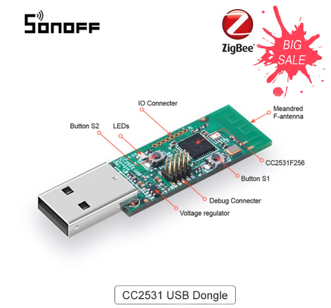 Zigbee needs its own controller and I'm pleased to say they can be acquired from Aliexpress for a few dollars. The CC2531 can be purchased without firmware, but this requires you to flash it yourself. As I was unfamiliar with the whole process, I bought one already flashed with "SONOFF Zigbee for Zigbee2mqtt."
