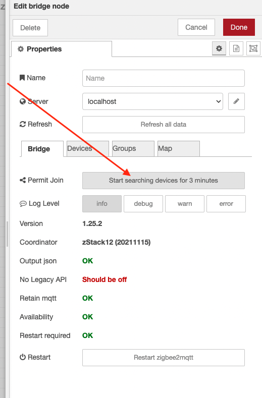 Once that's done, you need to get the zigbee2mqtt bridge node to recognize your zigbee devices. For me, this meant putting my IKEA bulb and Motion Sensor into pairing mode and waiting for my dongle to find them. At zigbee2mqtt.io there's a detailed page with instructions for all the devices that are known to pair with it.