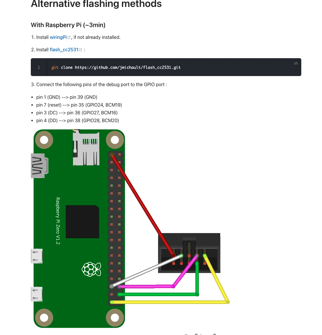 Into the other side of the cable, I plugged Dupont wires. This made it easy to plug the appropriate wires into the RasPi pins. (Note, when I did the flashing, the dongle was NOT plugged into the Pi USB. Instead it gets its power from the 3.3v pin of the RasPi.)